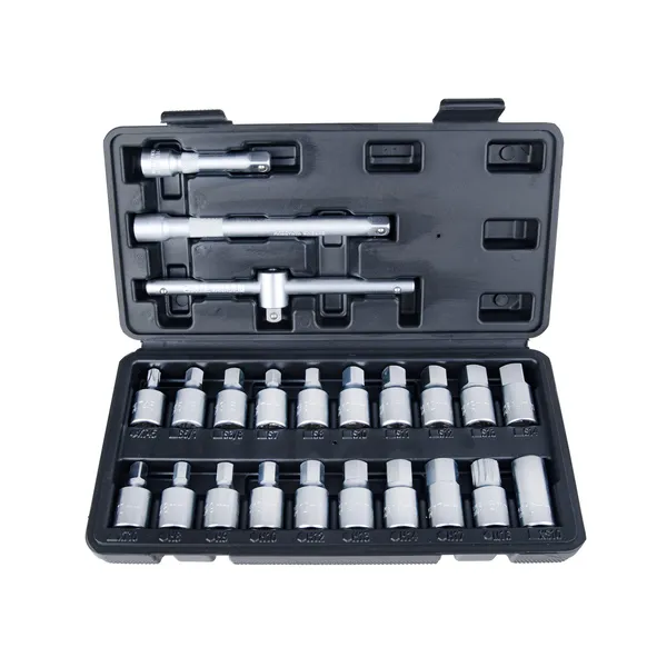 Dolgozz magabiztosan még a legmakacsabb olajleeresztő csavarokkal is: ez a 23 részes olajleeresztő csavar kulcskészlet széles bitválasztékával ideális autószerelőknek, műszaki vizsgaállomásoknak és igényes barkácsolóknak. A króm-vanádium (CrV) acél nagy terhelésnél is megbízható, így kisebb az elcsúszás és a csavarfej sérülésének esélye.