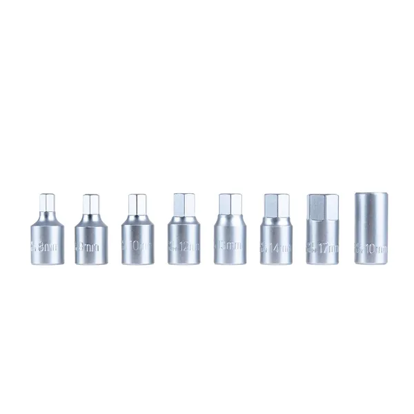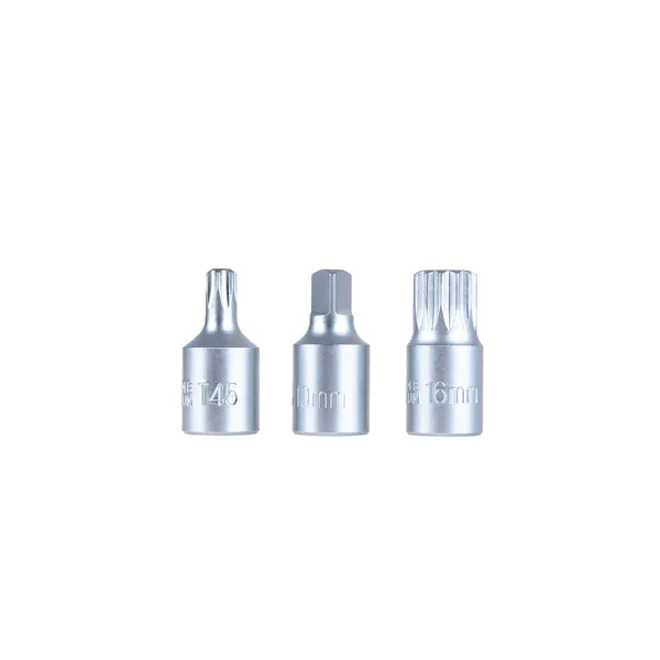 A készlet tartalma (23 db): 3 pontos: XT10; 4 pontos: S7, S8, S10, S11, S12, S13, S14, S5/16″, S3/8″; 6 pontos (HEX): H8, H9, H10, H12, H13, H14, H17; 6 pontos (Torx): XT45; 12 pontos furattal: M16; négyszög csavarhoz: XS10; csúszó T-markolat 3/8″: 7,5 cm; csúszó T-markolat 3/8″: 15 cm; 3/8″ meghajtó.