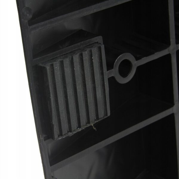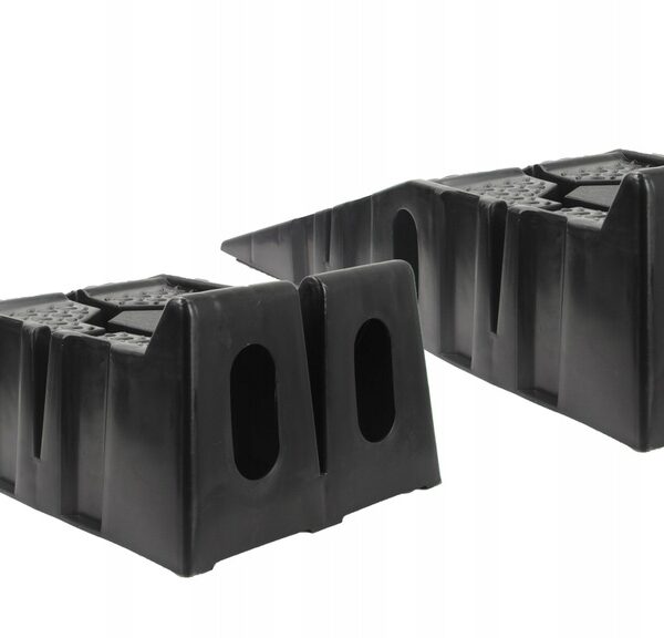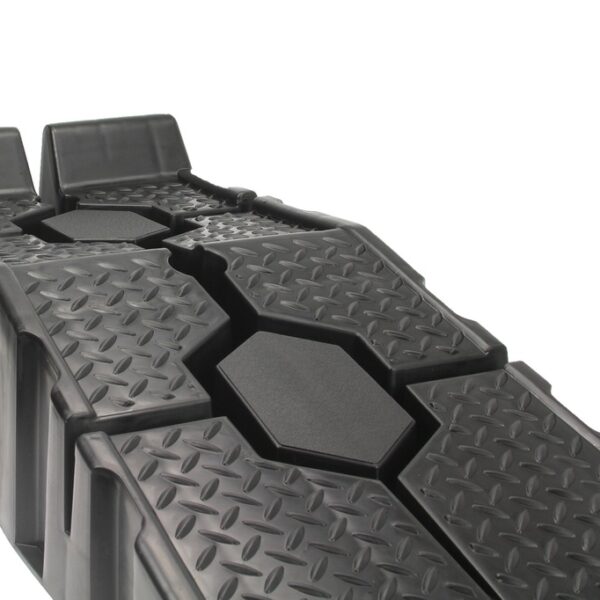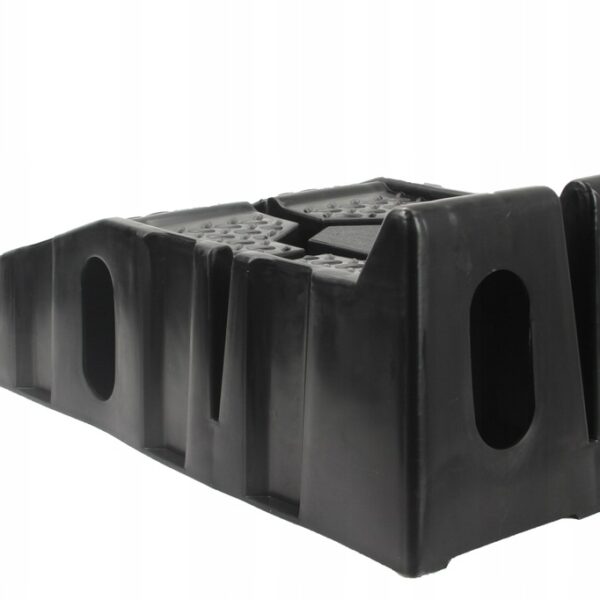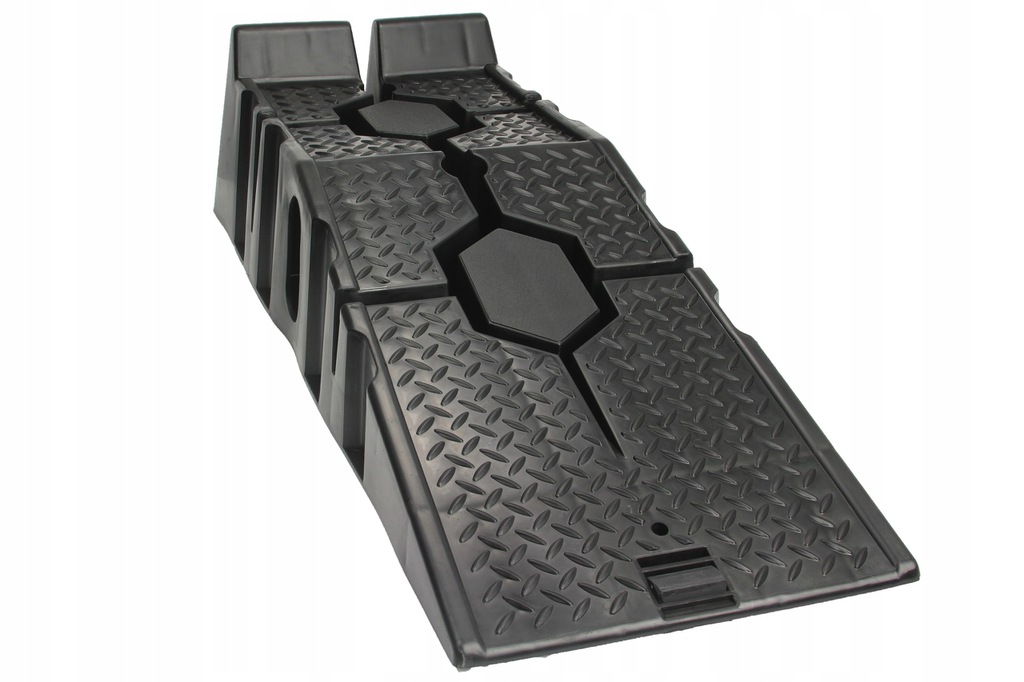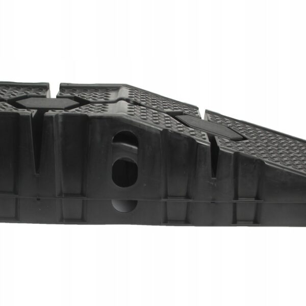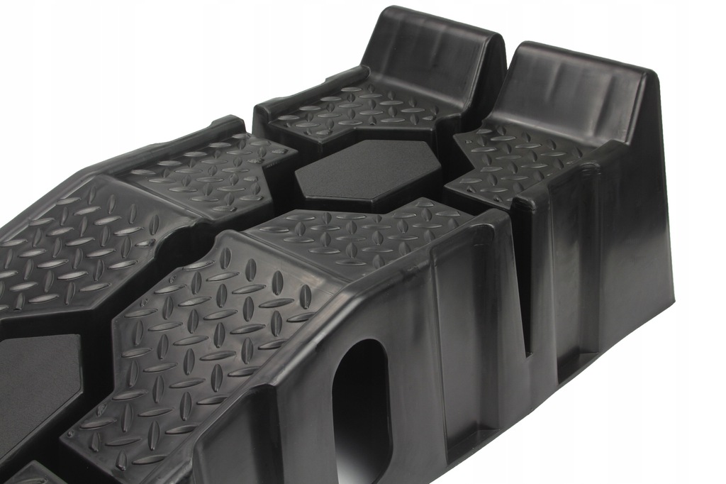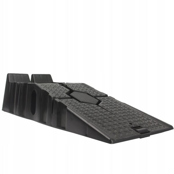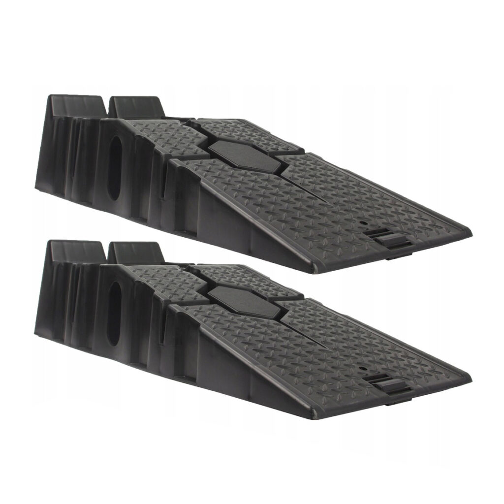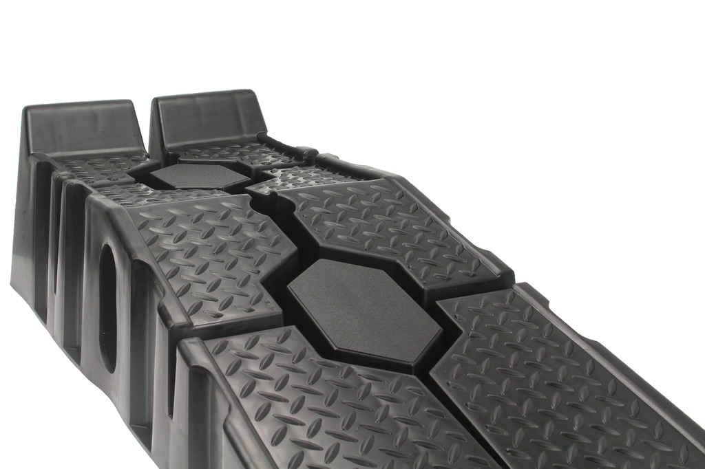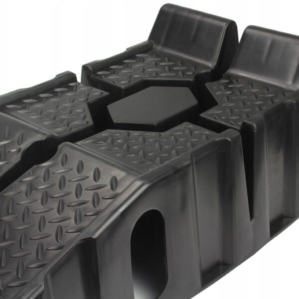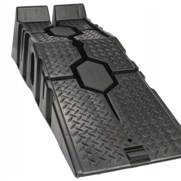 Speciális csúszásgátló gumi. Minden rámpa alján egy speciális gumibetét található, amely megakadályozza a rámpa csúszós felületeken való csúszását. Anyaghornyok és magas biztonsági küszöb. A rámpák magas küszöbbel vannak felszerelve, hogy megakadályozzák az autó előregurulását. Ezenkívül a teljes rámpa speciális szerkezettel van bevonva a tapadás növelése érdekében. Ideális otthoni műhelyekbe, különösen olajcseréhez és kisebb mechanikai munkákhoz autókon. A rámpák speciálisan kialakított alapokkal rendelkeznek, amelyek lehetővé teszik, hogy az egyik rámpát a másikra helyezzük, ami jelentősen csökkenti a tároláshoz szükséges helyet.