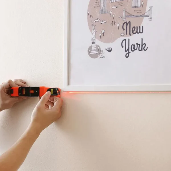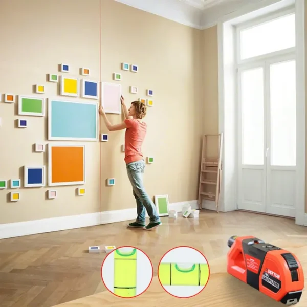 Tartalmaz egy 2,4 méteres mérőszalagot, vízszintes és függőleges vízmérték-fiolákat, valamint egy lézermutatót, 15 méteres hatótávolsággal.
