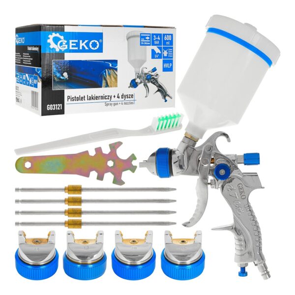 GEKO festékszóró pisztoly HVLP + 4 fúvóka (1,4-1,7-2,0-2,5) G03121