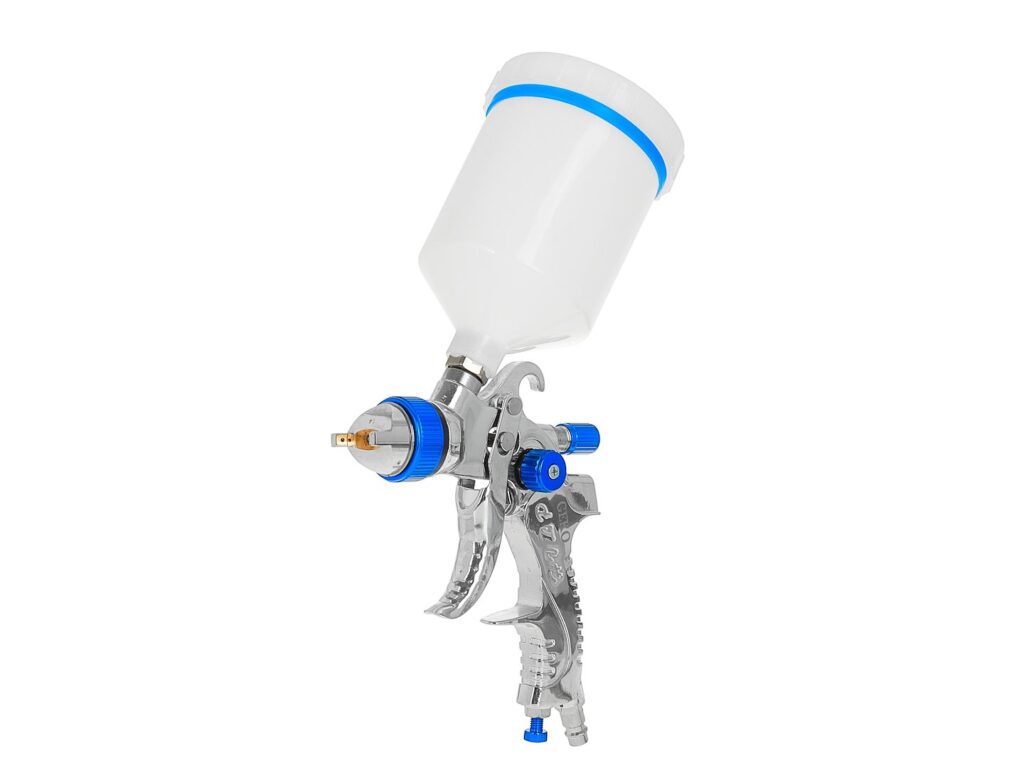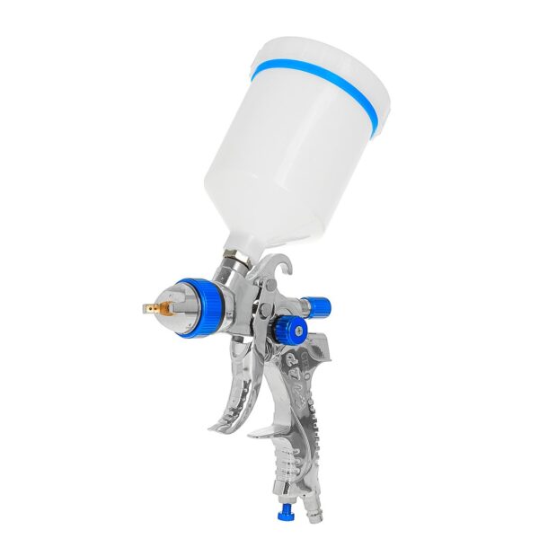 Professzionális HVLP festékszóró pisztoly, amelyet festékek, lakkok, pácok és alapozók precíz felvitelére terveztek. Az alacsony levegőfogyasztás és a magas festékátviteli hatékonyság egyenletes lefedettséget, csökkentett anyagpazarlást és kiváló szórásvezérlést biztosít.