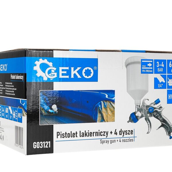 • GEKO festékszóró pisztoly HVLP + 4 fúvóka (1,4-1,7-2,0-2,5) G03121