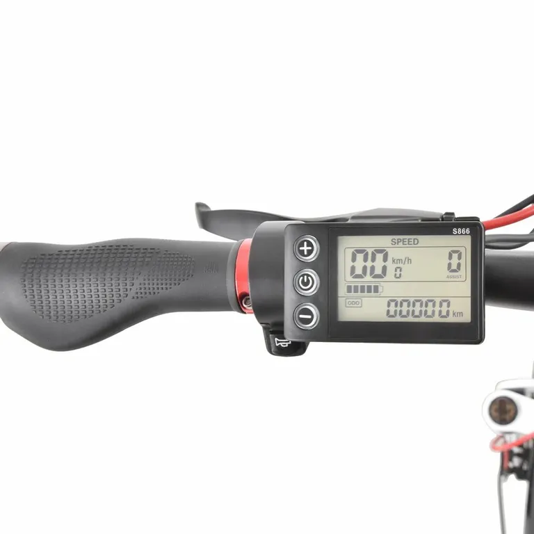 Az e-bike kezelése egyszerű. Mindent a bal kormányon található három gomb vezérel. Az e-bike be- vagy kikapcsolásához nyomja meg és tartsa lenyomva az M gombot; ennek a gombnak a rövid megnyomásával válthat a képernyőn megjelenő információk között. Ezután a plusz / mínusz (+/–) gombokkal állítsa be a rásegítés intenzitását öt lépésben. Nyomja meg és tartsa lenyomva a plusz (+) gombot a fényszóró és a kijelző világítás be- vagy kikapcsolásához. Értékes funkció a járásasszisztens. A mínusz (-) gomb hosszan nyomva tartásával, két másodperc elteltével a kerékpár sétasegítő módba kapcsol, és körülbelül 6 km/h sebességgel indul el. Ezt a funkciót biztosan használni fogja, például, ha meredek dombon tolja fel a kerékpárt. A járásasszisztens csak akkor aktiválódik, ha lenyomva tartja a mínusz (-) gombot. Amint elengedi a gombot, a kerék azonnal leáll.