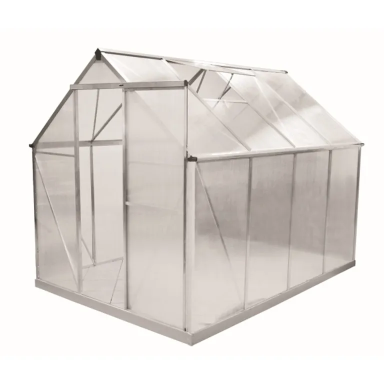 Kiváló hőszigetelő tulajdonságokkal rendelkező, alumíniumprofilokból készült kerti üvegház, teljes körkörös cellás polikarbonát lemezekkel. Tökéletes és egyszerű megoldás mindazok számára, akik nem akarnak nehéz tégla- vagy acél üvegházat építeni nehéz töltettel, de mégis melegkedvelő növényeket, zöldségeket vagy gyümölcsöket szeretnének termeszteni vagy teleltetni. Egy egyszárnyú tolóajtóval és két szellőző, zsanéros ablakkal felszerelt. Az üvegházhoz ingyenes acél talapzat is tartozik. Szilárd és könnyű szerkezet. A váz alumíniumprofilokból készül, amelyek kis súlyúak és hosszú élettartamúak, minimális karbantartást igényelnek. Ráadásul korrózióállók, ami különösen fontos, ha az üvegházban nedves klíma uralkodik. Az egyszerű összeszerelésnek köszönhetően elkerülheti a nehéz építési munkálatokat, az alumíniumszerkezet pedig modern megjelenésű és könnyen tisztítható. Az üvegház így nemcsak hasznos, hanem esztétikus kiegészítője is lesz kertjének. Könnyű összeszerelés. Az üvegházat otthon is össze lehet szerelni építőszerszámok és speciális ismeretek nélkül. Az alumíniumszerkezet hétköznapi szerszámokkal is összeszerelhető és két ember kényelmesen elfér benne. Ezenfelül a töltetek rögzítésére szolgáló horonyrendszer növeli az egész üvegház szilárdságát, és lehetővé teszi a sérült töltetek cseréjét anélkül, hogy a teljes szerkezetet szét kellene szedni. Az üvegház egyéb felszerelései Az ablakokhoz (a válaszfal megerősítése után) önnyíló szerkezet is felszerelhető, amely automatikus szellőzést biztosít, kézi nyitás szükségessége nélkül. A belső falakon tartós alumínium polcok helyezhetők el egyéb berendezések vagy virágtartók számára. Az üvegház oldalai ereszcsatornákkal vannak ellátva, amelyeket külön lehet hozzá megvásárolni. Minőségi töltőanyagok UV szűrővel. Az üvegház töltetei polikarbonátból készülnek, kizárólag a német Bayer cég granulátumából. Ez tehát semmiképpen sem olyan újrahasznosított anyag, amely szennyeződéseket tartalmaz és ezáltal csökkenti a fényáteresztést. A polikarbonátot az EU országaiban való használatra tervezték. A panelek kiválóan áteresztik a napfényt (kb. 80%), és nem terhelik túl a szerkezetet. Kívülről UV-szűrővel rendelkeznek, hogy megvédjék a növényeket a káros napsugárzástól.