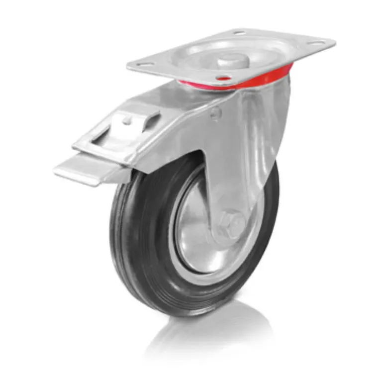 Merevített fémvillás, forgó talpas és fékezhető, négy helyen rögzíthető gumis futófelületű ipari kerék. Az abroncsa szabvány tömörgumi, kiváló szállítási kényelem, halk futás jellemzi, nagyon padlókímélő, fekete színű. Felnije acéllemezből préselt, galvanikusan horganyzott, kék passzivált, A műszaki kerék csapágytípusa tűgörgős csapágy, hosszú élettartamú zsírral kenve. Egyéb tulajdonságai közé tartozik, hogy a gumis futófelületű műszaki keréknek magas a kémiai ellenállósága sok agresszív anyaggal szemben. Felhasználási hőmérséklet: -25° C és +80° C között. +60° C feletti környezeti hőmérséklet esetén csökken a teherbírás. Normál használat mellett karbantartást nem igényel. Ajánljuk raktári kocsik, üzemi szállítókocsik és egyéb szállítóeszközökhöz, ahol nincs speciális felhasználási igény… (bővebben a műszaki kerekekről)