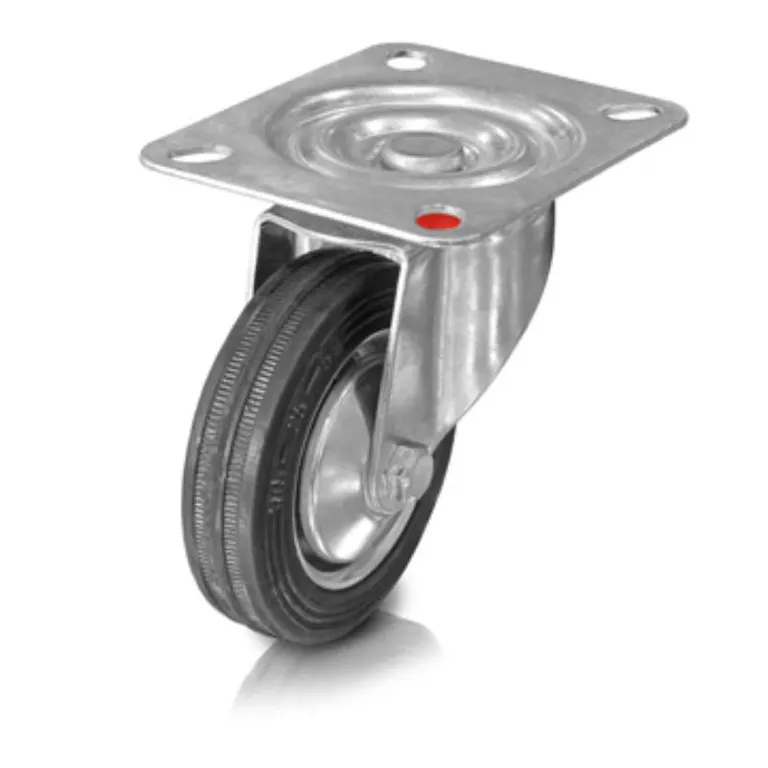 Merevített fémvillás, forgó talpas négy helyen rögzíthető gumis futófelületű ipari kerék. Az abroncsa szabvány tömörgumi, kiváló szállítási kényelem, halk futás jellemzi, nagyon padlókímélő, fekete színű. Felnije acéllemezből préselt, galvanikusan horganyzott, kék passzivált, A műszaki kerék csapágytípusa tűgörgős csapágy, hosszú élettartamú zsírral kenve. Egyéb tulajdonságai közé tartozik, hogy a gumis futófelületű műszaki keréknek magas a kémiai ellenállósága sok agresszív anyaggal szemben. Felhasználási hőmérséklet: -25° C és +80° C között. +60° C feletti környezeti hőmérséklet esetén csökken a teherbírás. Normál használat mellett karbantartást nem igényel. Ajánljuk raktári kocsik, üzemi szállítókocsik és egyéb szállítóeszközökhöz, ahol nincs speciális felhasználási igény… (bővebben a műszaki kerekekről)