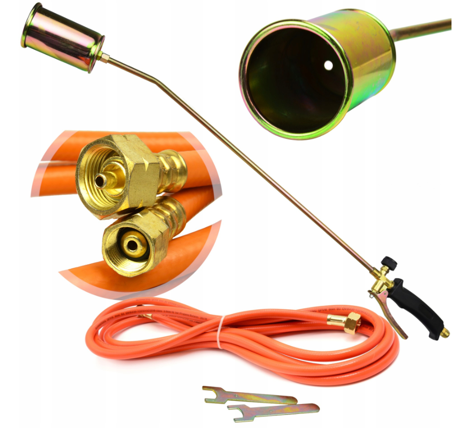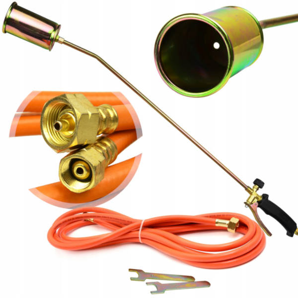 Egyfúvókás gázperzselő 60 mm átmérőjű diffúzorral és kiváló minőségű 5 m-es tömlővel, amely közvetlenül a gázpalackhoz csatlakozik.