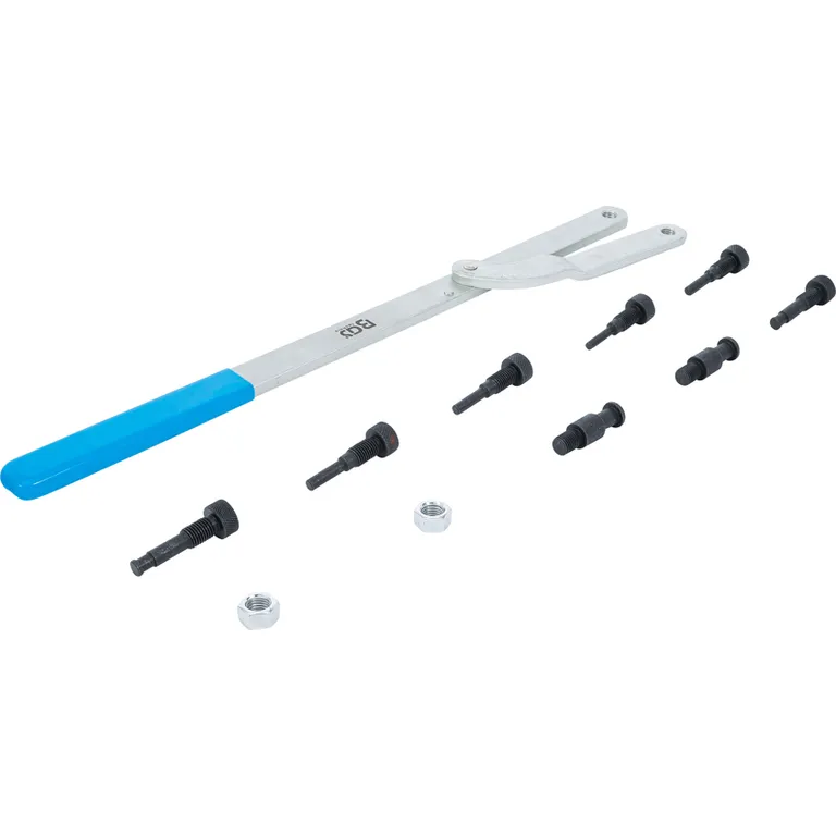 • 4 pár Ø 6-10 mm, 8 – 11 mm, 10 – 12 mm, 11 – 16 mm méretű cserélhető tartócsappal, ezért szinte minden vezérműtengely-járókerékhez alkalmas.