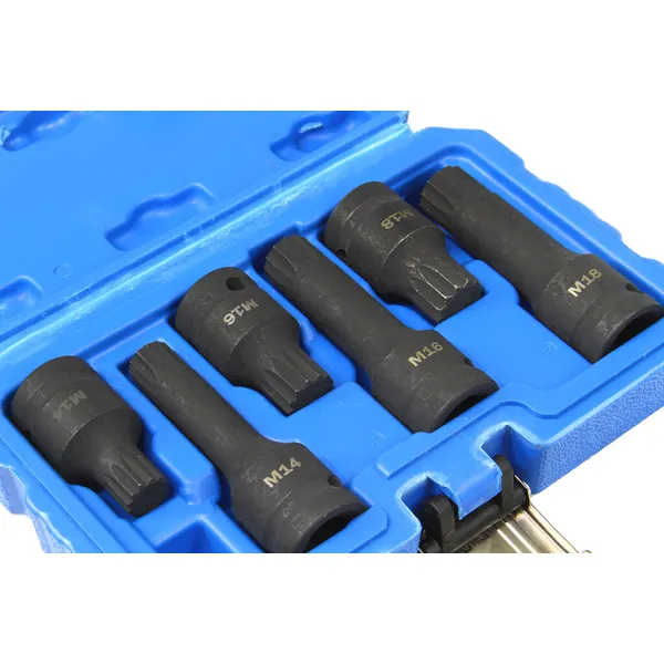 Professzionális, 6 részes SPLINE ütvecsavarozó dugókulcs készlet, amelyet kifejezetten nagy igénybevételű autószerelési és gépészeti munkákhoz terveztek. Ideális választás, ha megbízható szerszámot keresel VW LT, Transporter, Sharan vagy Golf típusok szereléséhez, illetve olyan javításokhoz, ahol a biztos illeszkedés és az ütésállóság kulcskérdés.