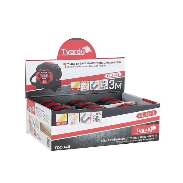 Tvardy kétoldalas nejlon mágneses mérőszalag auto-stop 3m/16mm CLASS I 12db/display box T00346