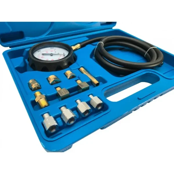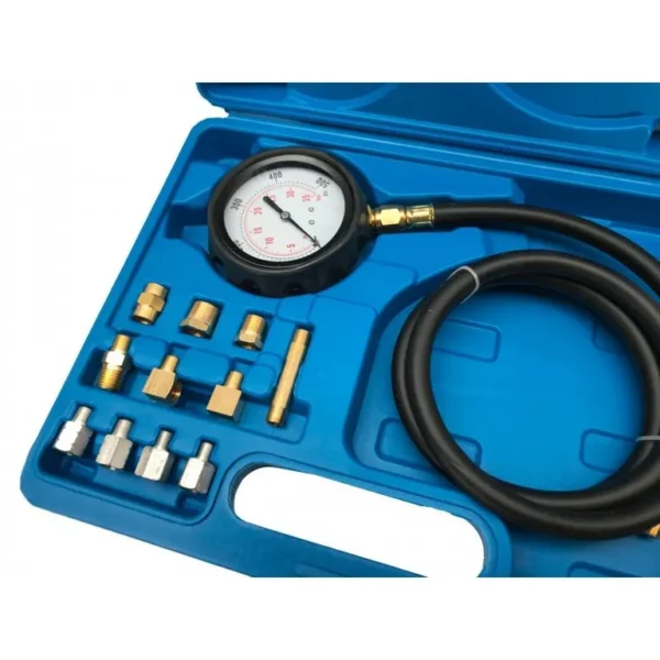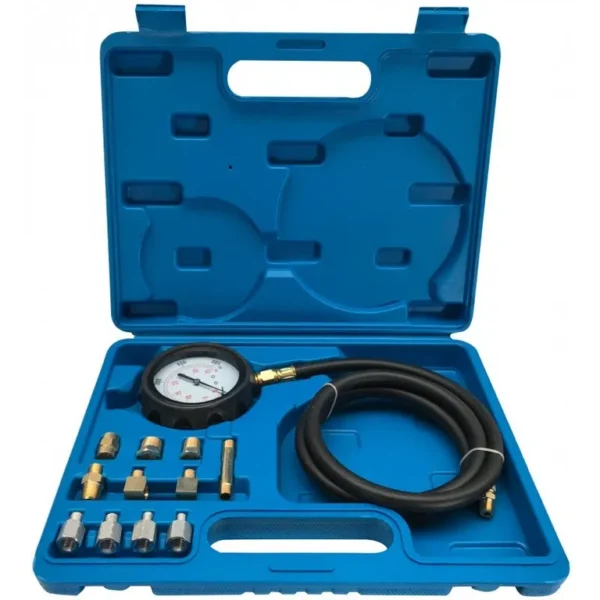Olajnyomásmérő készlet, mely különböző adapterek segítségével az autók többségéhez használható. A nagyméretű óra segíti a könnyebb leolvashatóságot. A készletben található tömlőn lévő gyorscsatlakozó segítségével nagyon könnyű és gyors a használata. Praktikus műanyag kofferben , ennek köszönhetően az olajnyomásmérő adapterei, csatlakozói nem vesznek el.